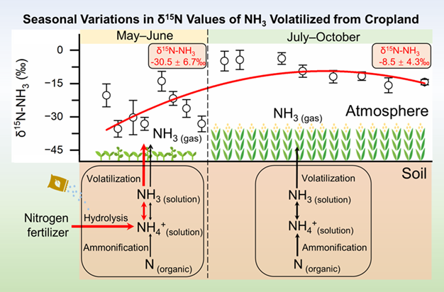 该研究成果以“Large Seasonal Variation inNitrogen Isotopic Abundances of Ammonia Volatilized from a Cropland Ecosystem and Implications for Regional NH3 Source Partitioning”为题于2024年1月3日正式发表于Environmental Science & Technology。沈阳应用生态研究所博士后、特别研究助理宋琳琳为第一作者,方运霆研究员为通讯作者。该研究得到了国家重点研发计划“大气污染成因与控制技术研究”重点专项项目(2017YFC0212700),大气重污染成因与治理攻关项目(DQGG0105-02)等项目资助。