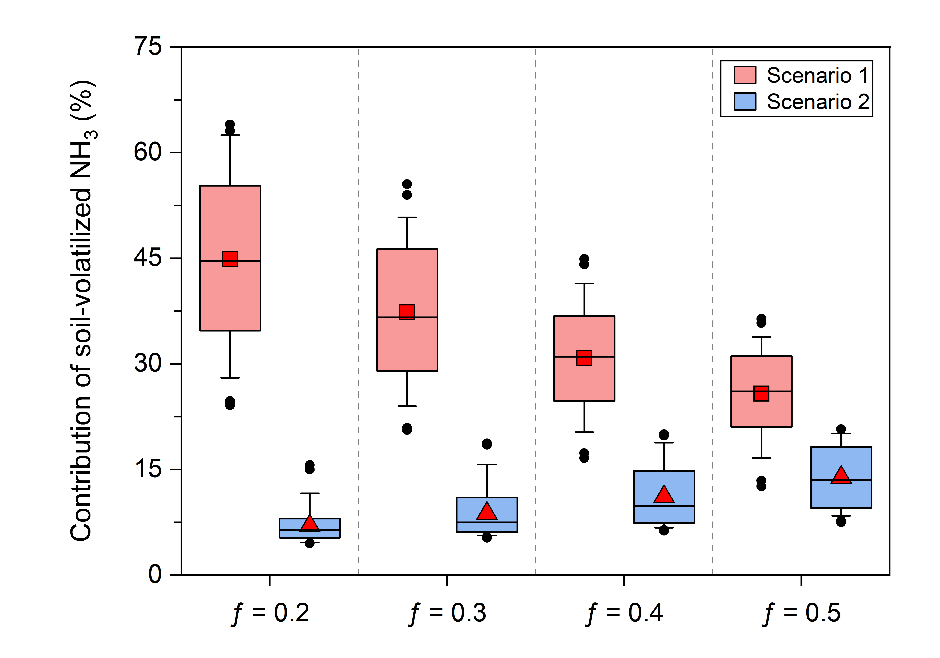 图2 不同情景模拟下,农田土壤挥发NH3源对7-10月间东北地区大气NH3来源分配结果。