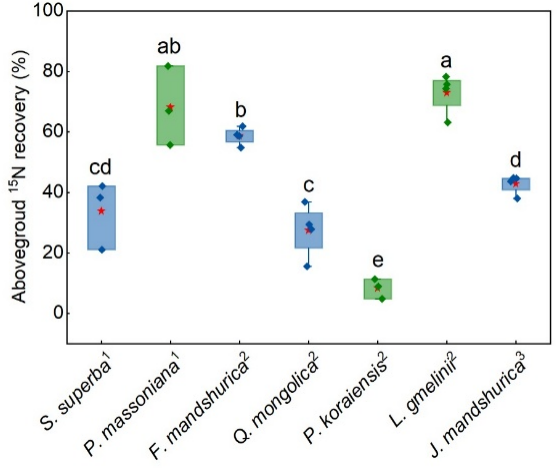 为了评估森林乔木叶片对NO2的吸收能力以及分配策略,中国科学院沈阳应用生态研究所稳定同位素生态学团队利用15N同位素示踪技术,选取中国东北温带森林四种优势乔木树种幼苗(蒙古栎、水曲柳、落叶松、红松),在不同光照或土壤施氮条件下,利用50 ppb的 15NO2对乔木幼苗进行8 h的动态熏蒸,量化了乔木幼苗叶片对NO2的吸收与分配。
