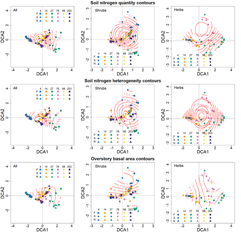 在不同立地年龄(4,14,27,76,98,203)和地形(F = 平坡;S = 南坡;N = 北坡)条件下林下植被除趋势对应分析(DCA)