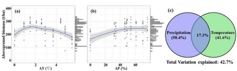 图1. 地上生物量对温度和降水的敏感性。(a)和(b)分别表示温度和降水变化下模拟的地上生物量,(c)表示由温度和降水对地上生物量变异的解释程度
