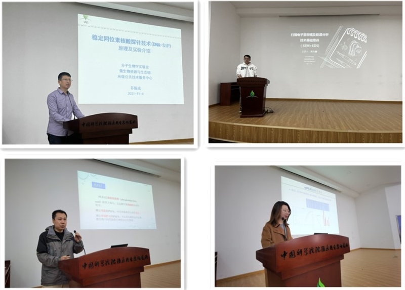 4日上午,全体学员在北楼多功能厅参加技术理论讲解。沈阳应用生态研究所副所长、所级中心主任方运霆研究员,微生物资源与生态组组长徐明恺研究员,所级中心副主任崔杰华高级工程师参加了培训班。方运霆副所长在开班仪式中致辞,对分子生物学实验室的工作予以充分肯定;徐明恺研究员对分子生物学实验室进行了简要介绍。培训由李想、李旭、班允赫和苏振成四位老师分别就荧光定量PCR技术,磷脂脂肪酸分析(PLFA)技术,扫描电镜成像及能谱分析技术,稳定同位素核酸探针技术(DNA-SIP)进行系统讲解。4日下午和5日上午,全体学员共分成七个小组,在南楼311、317、324和328四个实验室分别进行四项技术的演示操作,并利用自带样品亲自操作。培训后,学员们在于志雄、谷舞、代雨朦和张致淳四位同学的带领下,参观分子生物学实验室,了解实验室仪器设备及其功能。