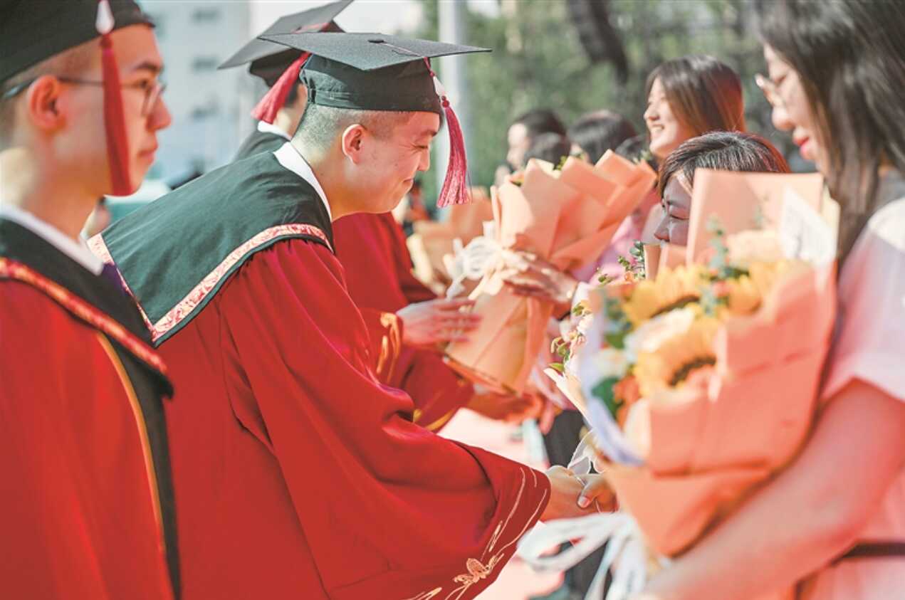近日,中国人民大学举办2025年毕业日系列活动,包括毕业典礼、学位授予仪式、青春歌会等。图为毕业生在毕业典礼上为教职工代表献花。新华社发