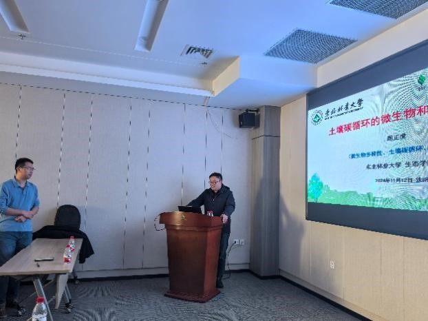 2024年11月12日,我室举办中国科学院沈阳应用生态研究所第四十一期“应用生态学论坛”。本次论坛邀请了东北林业大学的周正虎教授进行专题学术报告,报告题目为“土壤碳循环的微生物和矿物驱动机制”。本次论坛由沈阳应用生态研究所、我室孙涛研究员主持,吸引了所内50余位青年科研工作者及研究生参会。