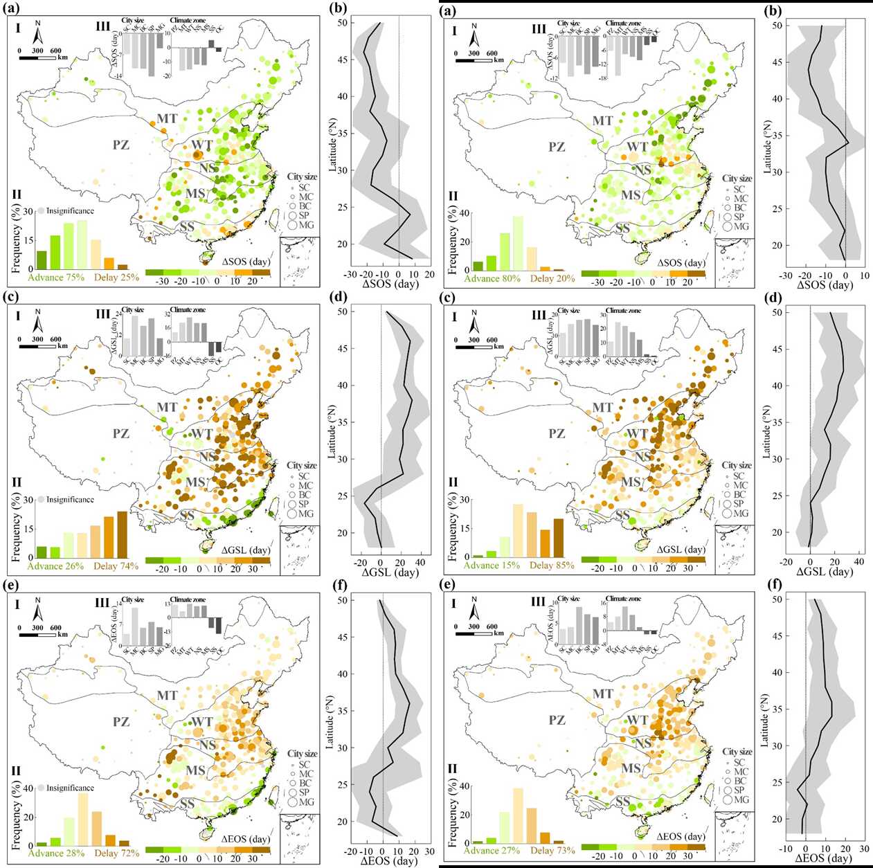 基于此,我室利用多源数据评估了中国365个城市的植被物候(包括生长期开始、结束和长度:SOS、EOS和GSL)的长期(2003-2020年)和内外(城市空间内外)变化。采用SHAP模型和累积局部效应模型,确定了关键驱动因素及其变化模式。研究发现,与长期变化相比,城市植被物候在内外变化中变化更为一致。75%的城市SOS的长期变化提前了-15.96±10.30 d,74%的城市GSL和72%的城市EOS的长期变化分别延长了23.89±13.81 d和11.93±8.99 d。80%城市的SOS在内外变化中提前(-12.81±9.33 d),85%城市的GSL和73%城市的EOS分别延长和延迟(18.28±13.17 d和10.91±7.59 d)。城市植被物候的长期变化和内外变化在不同城市规模之间存在显著差异。从南向北的气候带,城市植被物候在长期变化上呈现明显梯度变化,但在城市内外变化不大。SHAP分析显示,温度是影响城市植被物候的最重要因素,其次是夜间照明和辐射,这些驱动因素与城市植被物候呈现复杂的非线性关系。该研究结果量化了城市化对城市植被物候时空特征的影响,有助于明确未来气候变化对植被物候的可能影响,更好地理解快速城市化背景下城市生态系统的变化特征。