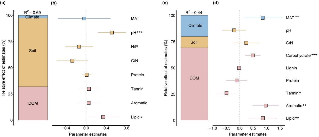 这项研究强调了DOM分子特征在塑造微生物群落结构和生态功能中的重要性,拓展了对森林生态系统中DOM化学多样性及其生态学意义的认知。研究成果有助于深入理解环境因素如何调控土壤微生物群落及其对全球碳循环的潜在影响,并为未来森林生态系统管理与碳汇调控提供科学支撑。