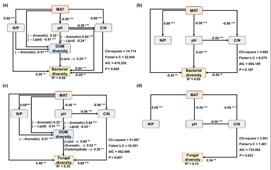 针对这一科学问题,我室基于中国东部南北跨越约 4000 公里的森林样带,采用傅里叶变换离子回旋共振质谱(FT-ICR-MS)和高通量测序技术,对土壤 DOM 组成及微生物多样性进行了系统分析。研究发现:DOM 成分的生物地理分布对细菌和真菌多样性具有不同的影响:脂类化合物与细菌多样性关系最为密切,而芳香类、碳水化合物类和脂类化合物对真菌多样性影响较大(图1)。线性模型和结构方程模型分析表明,DOM多样性在温度和土壤特性影响微生物空间分布的过程中起到了关键的中介作用(图2)。