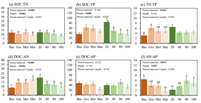 图2 不同母质和深度土壤全量及速效碳、氮、磷计量比