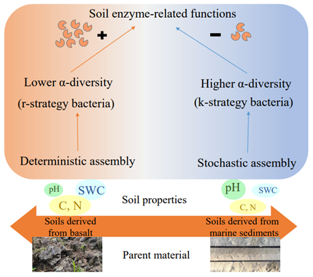 (2)解析了不同母质土壤微生物群落组成和功能的构建机制。橡胶园不同母质土壤细菌群落构建由同质选择、扩散限制和漂变过程主导。玄武岩母质土壤较低的 pH 值和较高的水分条件下,细菌群落构建过程以同质选择为主,群落周转率低,多样性降低,但碳和氮转化酶活性较高。随着确定性构建过程的比例降低、随机过程的比例增加,细菌群落多样性显著增加。在海相沉积物母质土壤中,水分、有机碳和速效氮含量较低,细菌群落扩散受限,多样性增加,微生物分泌氧化酶利用相对难分解底物的能力增强。不同母质土壤中细菌群落组成与酶相关功能的相关分析表明,r 策略拟杆菌门和鞘氨醇单胞菌、芽孢杆菌、弧菌属和苍白杆菌属促进微生物物质转化功能,而 k 策略酸杆菌门、疣微菌门和热酸菌属、伯克霍尔德氏菌-卡巴拉氏菌-拟伯克霍尔德氏菌属、HSB OF53-F07 与微生物功能呈负相关。上述研究成果以Parent material influences soil properties to shape bacterial community assembly processes, diversity, and enzyme-related functions为题于2024年3月发表在Science of The Total Environment期刊。