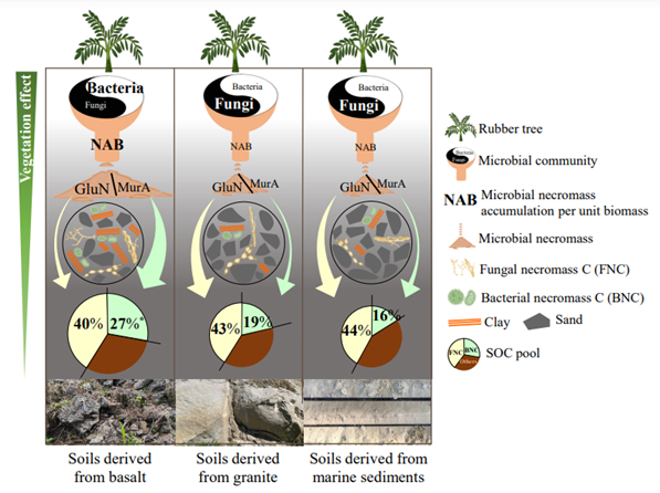 (3)阐明了母质和植被对剖面土壤微生物群落及其残体贡献有机碳的双向影响。与其他植被类型相比,橡胶园土壤微生物生物量呈现出更高的趋势,土壤微生物经过生长-死亡迭代积累的微生物死亡残体量显著高于其他植被土壤。研究区热带气候条件下,微生物物质循环较快,植被通过残体输入作为微生物底物对微生物残体积累的影响主要集中于 0–40 cm 上层土壤。玄武岩母质发育的粘质土壤中,粘粒级矿物可有效保护微生物死亡残体与 土壤有机碳,促进其积累。玄武岩母质土壤细菌在微生物群落结构及残体积累中占主导地位,其对有机碳的贡献显著高于其他母质土壤。由于真菌偏好较砂的土壤环境,花岗岩和海相沉积物母质发育的砂质土壤中,真菌主导微生物群落及其死亡残体积累。不同母质土壤质地差异显著影响真菌与细菌的生物量和死亡残体的相对变化,从而影响真菌和细菌死亡残体碳对土壤剖面有机碳的贡献。上述研究成果以Toward soil carbon storage: The influence of parent material and vegetation on profile-scale microbial community structure and necromass accumulation 为题于2024年3月发表在Soil Biology and Biochemistry期刊。以上研究可为橡胶园养分管理及热带地区土壤碳固存机制理解与碳汇功能提升提供重要理论依据。