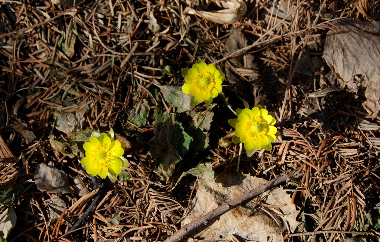 三月伊始,冰雪消融。北方的冬天刚刚过去,树木还没来得及换上新装。在园中闲逛的时候,突然发现地面长出了三朵黄色的小花。凑近一看,嚯,不知道什么时候开始,落叶中已经多了好些紫褐色的小脑袋,鼓鼓的,好像在为盛放积蓄着力量。这三朵明显是“好好学生”,已经率先露出了黄澄澄的花心。它们,就是早春植物——侧金盏花 (Adonis amurensis Regel et Radde)!