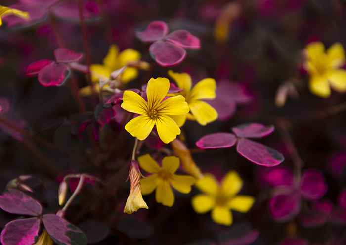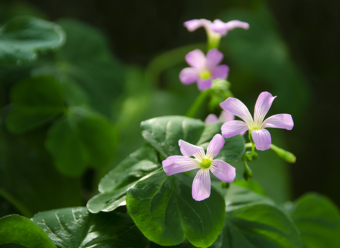酢浆草植物的花两性,辐射对称,5枚花瓣旋转排列,看上去十分温婉可人。与之形成鲜明对比的是它的果实,脾气非常暴躁,成熟时会突然炸开,将里面的种子弹射出去。弹射的力量可以把种子散播到远处,利于生命的延续。