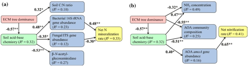 图2. 森林菌根类型调控土壤氮循环的“酸碱化学–微生物学”假说。红色和蓝色字体分别表示丛枝菌根森林和外生菌根森林具有较高的值