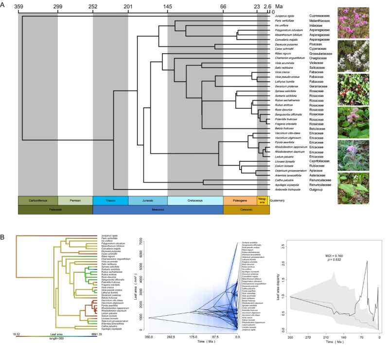 图1. 林下植被系统发育树(A)、林下植被各物种叶面积在系统发育树上的差异(B)、叶面积随地质时间的进化(C)及分异(D)