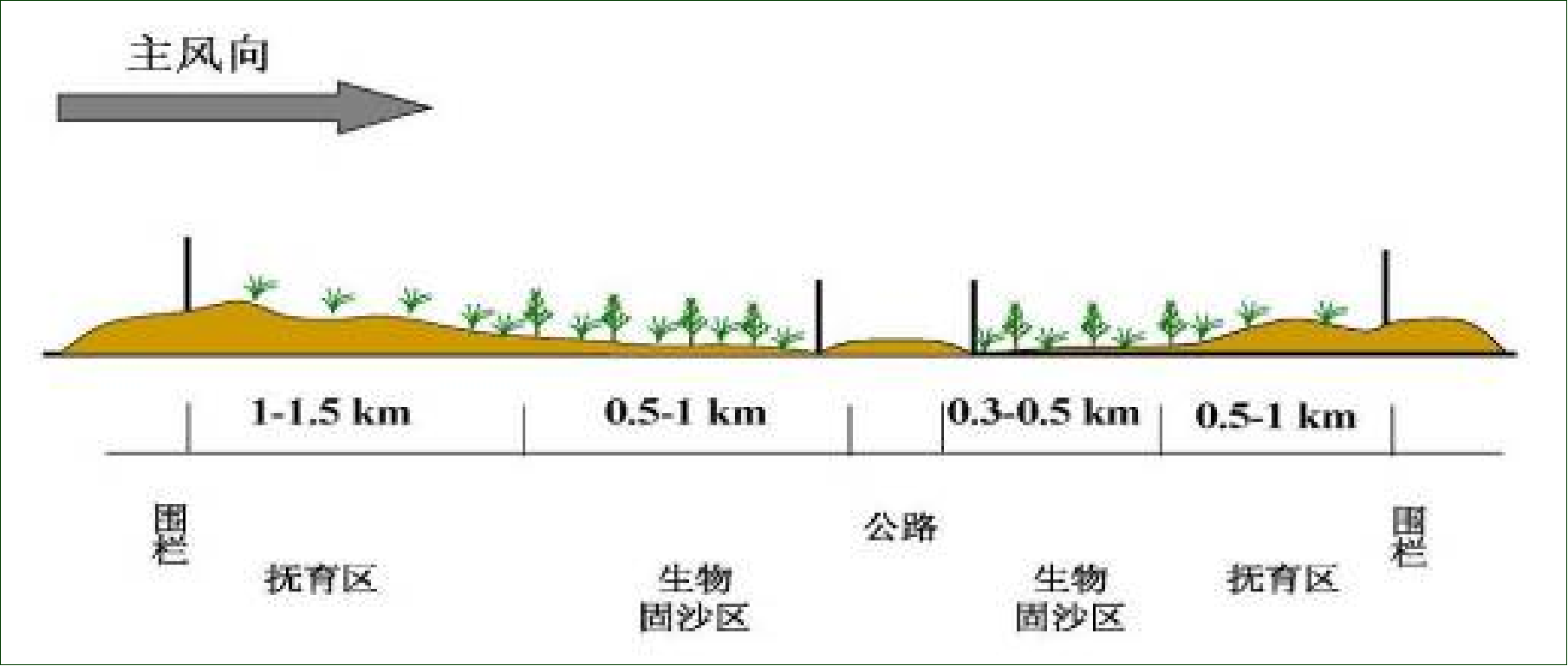 半固定沙地“生物固沙+人工补植+围栏封育”模式