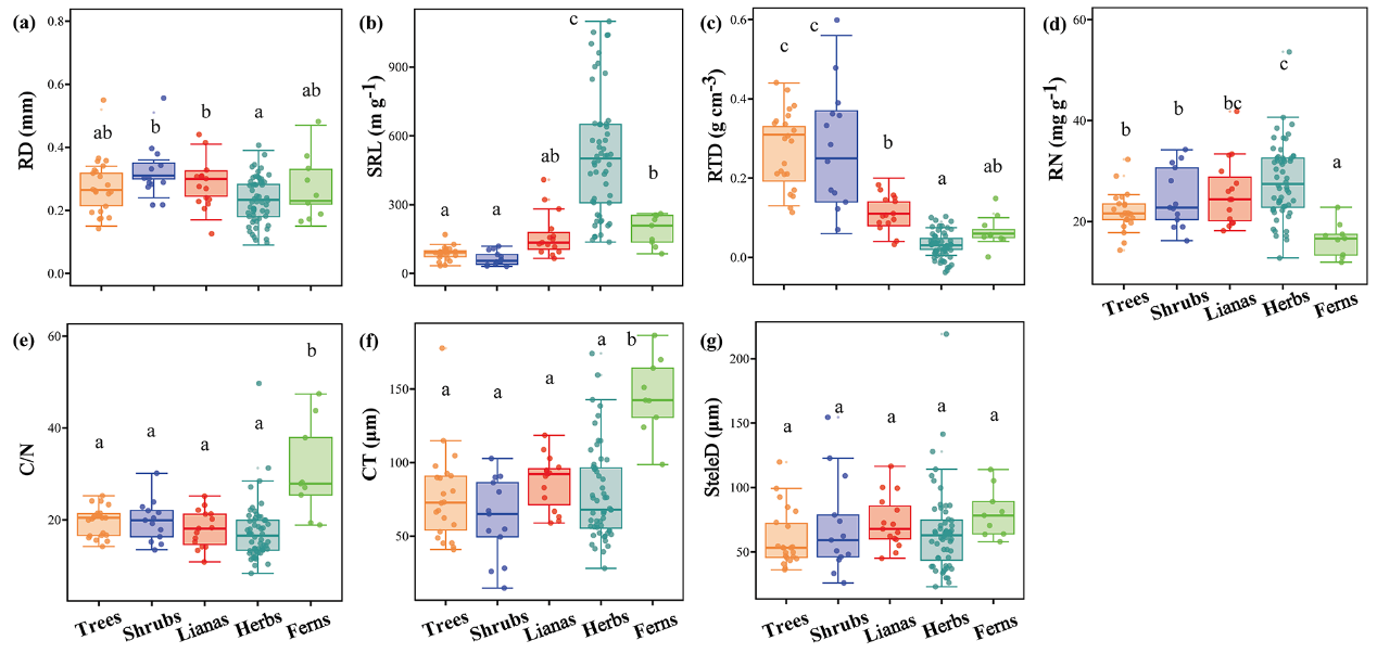 细根作为树木关键的养分吸收器官,其生理生态策略对林木生长和森林生态系统生产力至关重要。一个典型森林群落通常由乔木、灌木、草本等多种生活型植物构成,其长期共存策略与地上地下资源获取策略在不同生活型之间产生的巨大差异密不可分。然而,现有研究主要围绕树木地上部分,对根系功能性状及资源获取策略在多种生活型之间的差异缺少深入研究。