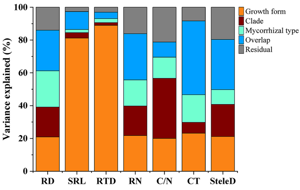 针对这一问题,研究团队以东北温带典型森林的次生林为研究对象,采集同一林分内的115种植物细根样本,涵盖乔木、灌木、木质藤本、草本和蕨类5种生活型。测定了7个细根关键功能性状指标。研究发现,在一个森林群落内部,不同生活型植物细根功能性状存在显著差异,尤其是比根长(Specific root length, SRL)和组织密度(Root tissue density, RTD)在5种生活型之间差异最大(图1)。与物种进化和菌根侵染类型相比,生活型是影响这些共生植物细根SRL和RTD变异的主要因素,分别解释了81%和88%的变异(图2)。研究进一步发现,这115种共生植物按生活型不同在根经济空间(Root economics space)中沿着SRL和RTD维度有规律地分布(图3),表明在一个森林群落内部,细根资源获取策略的多样性与植物的生活型有关。这种分布格局证实,不同生活型植物细根拥有不同资源获取策略,并能够占据不同的地下生态位,有利于缓解资源竞争和维持物种共存。