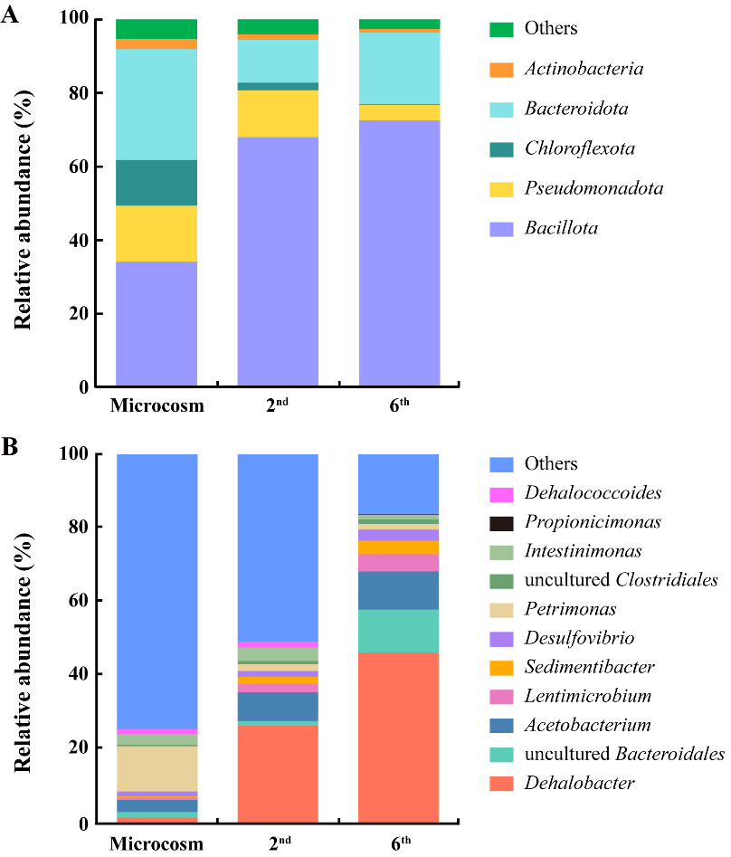 图2. 1,1,1-三氯乙烷脱氯富集培养物在门水平(A)和属水平(B)的微生物群落结构