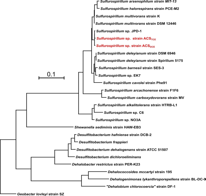 我室“污染环境微生物生态”研究团队前期与美国田纳西大学合作,在某污染场地土壤样品中发现并分离了两株有机卤呼吸型硫化螺旋菌属,并将其命名为ACSDCE菌株和ACSTCE菌株(图1)。ACSDCE菌株和ACSTCE菌株能够在pH低至5.5的培养条件下生长,并且将四氯乙烯分别脱氯至顺式二氯乙烯和三氯乙烯,为低pH污染环境的生物修复提供了潜在的微生物资源。