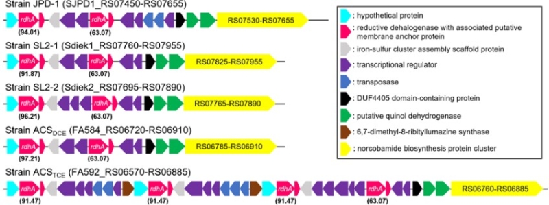 图2 ACSDCE 和ACSTCE与部分同属菌株在有机卤呼吸区域的基因比较图