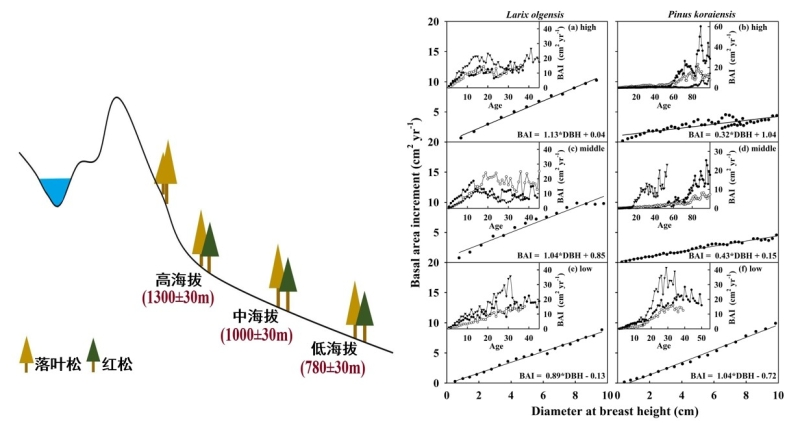 图1.沿海拔梯度采样示意图(左)与不同海拔下两树种径向生长规律(右)