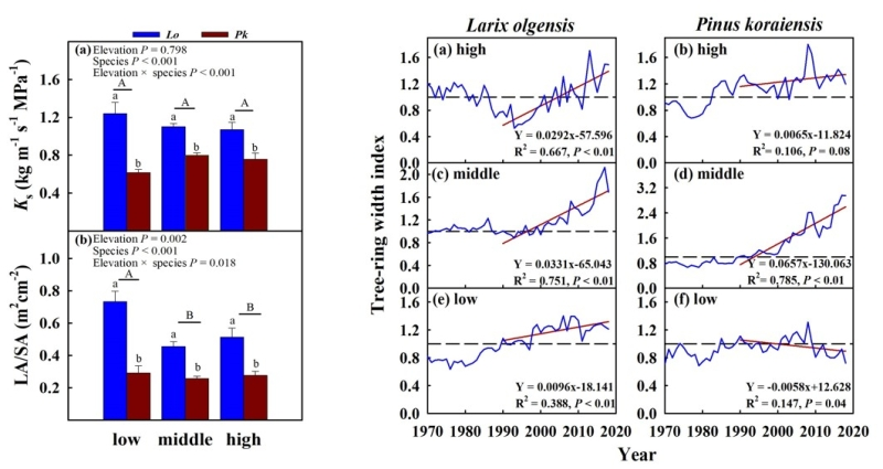 该研究成果近期以"Differences in growth pattern and response to climate warming between Larix olgensis and Pinus koraiensis in Northeast China are related to their distinctions in xylem hydraulics"为题发表在Agricultural and Forest Meteorology期刊。植物生理生态学科组博士研究生宁秋蕊为该论文的第一作者,郝广友研究员为通讯作者,该研究得到了国家自然科学基金(31870593,31722013)、中国科学院沈阳应用生态研究所特色所大团队等项目的支持。