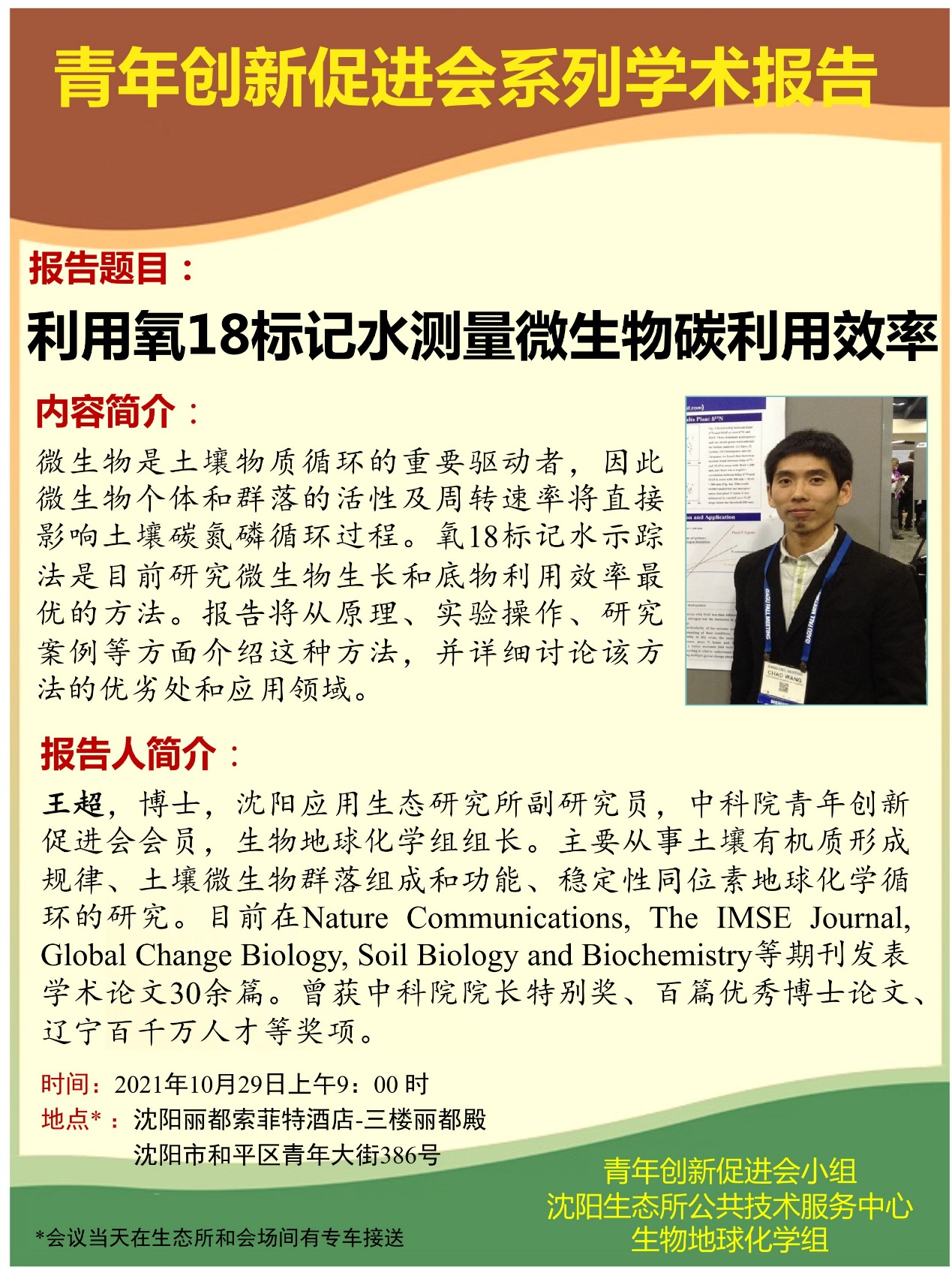 2021年10月29日,王超应邀做沈阳黑土地技术培训年会—青年创新促进会系列学术报告,报告题目:利用氧18标记水测量微生物碳利用效率。