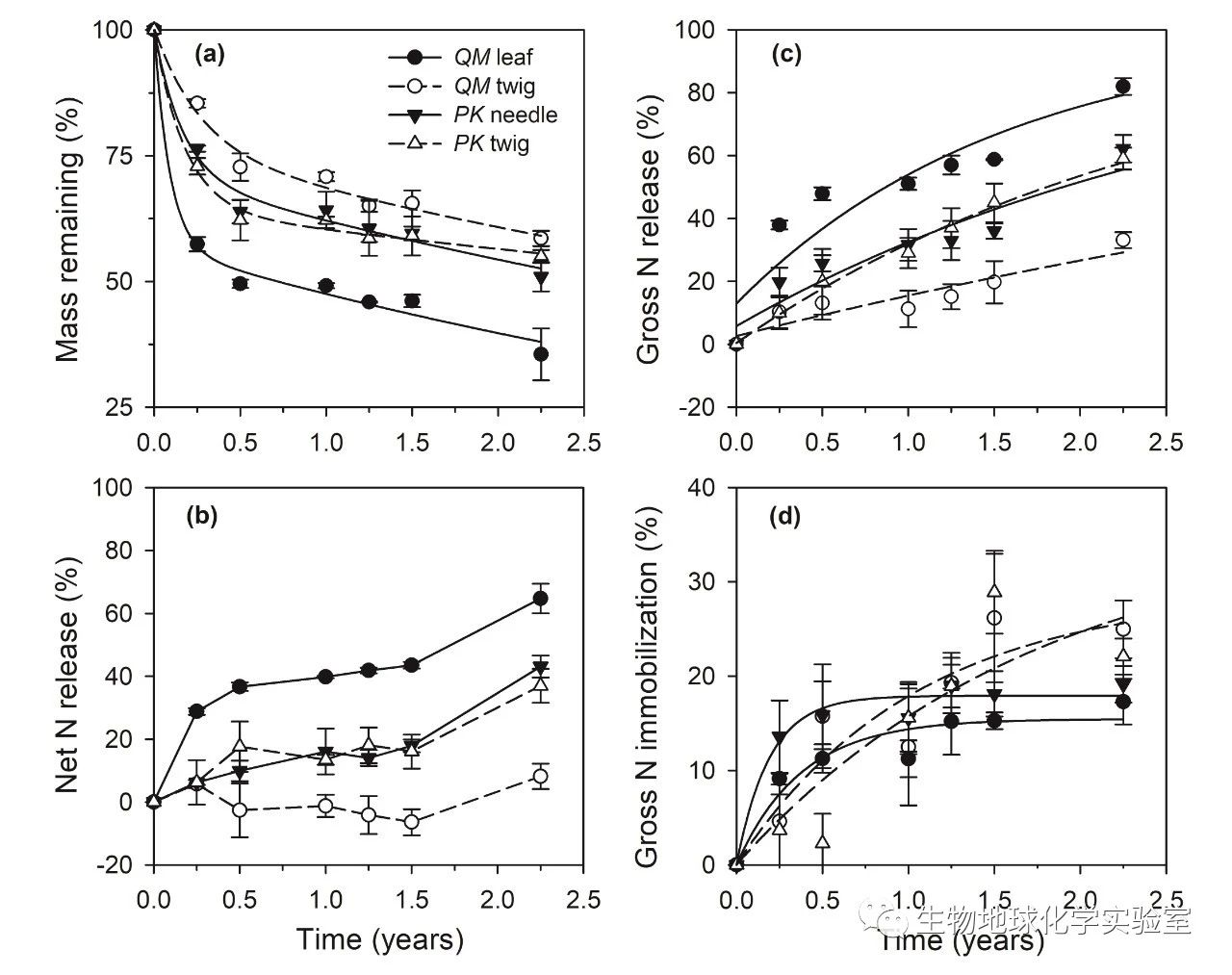 图1.凋落物的质量损失(a),净氮释放(b),总氮释放(c)和总氮固持(d)的动态变化。