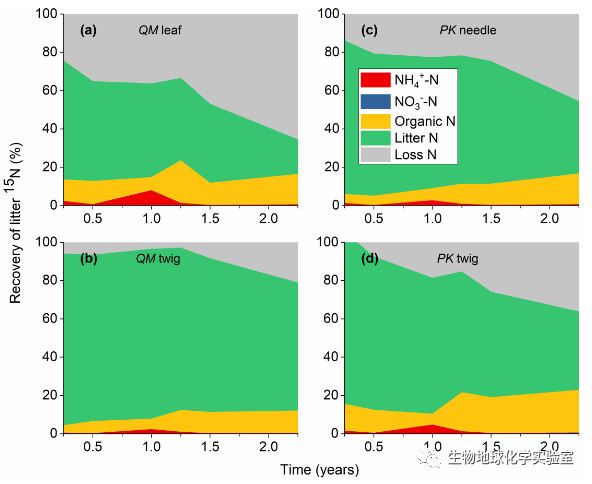 图2.凋落物氮在不同氮库中的回收率。