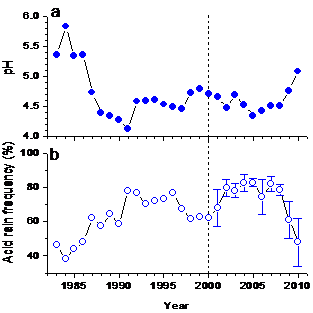 图1 广州市1983-2010年期间降水酸度和酸雨频率的变化