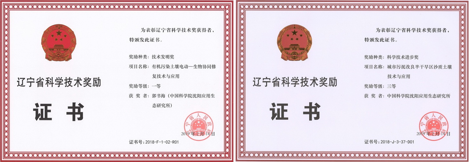 2月26日,辽宁省科学技术奖励大会在沈阳召开,颁发了2018年度辽宁省科学技术奖。沈阳生态所主持研究的2项成果获奖。“有机污染土壤电动-生物协同修复技术与应用”(完成人:郭书海等)获辽宁省技术发明奖一等奖,“城市污泥改良半干旱区沙质土壤技术与应用”(完成人:胡亚林等)获辽宁省科技进步三等奖。继2016年获辽宁省自然科学一等奖,2017年获辽宁省科技进步一等奖,今年又获辽宁省技术发明一等奖,这是沈阳生态所连续三年获得辽宁省科学技术一等奖,彰显研究所在助力地方经济社会发展的重要支撑和引领作用。 另外,由辽宁省农业科学院主持,中国科学院沈阳应用生态研究所参加的科研成果“旱作农田防蚀增效关键技术研究与集成应用”(完成人:谷健等)获辽宁省科技进步一等奖。