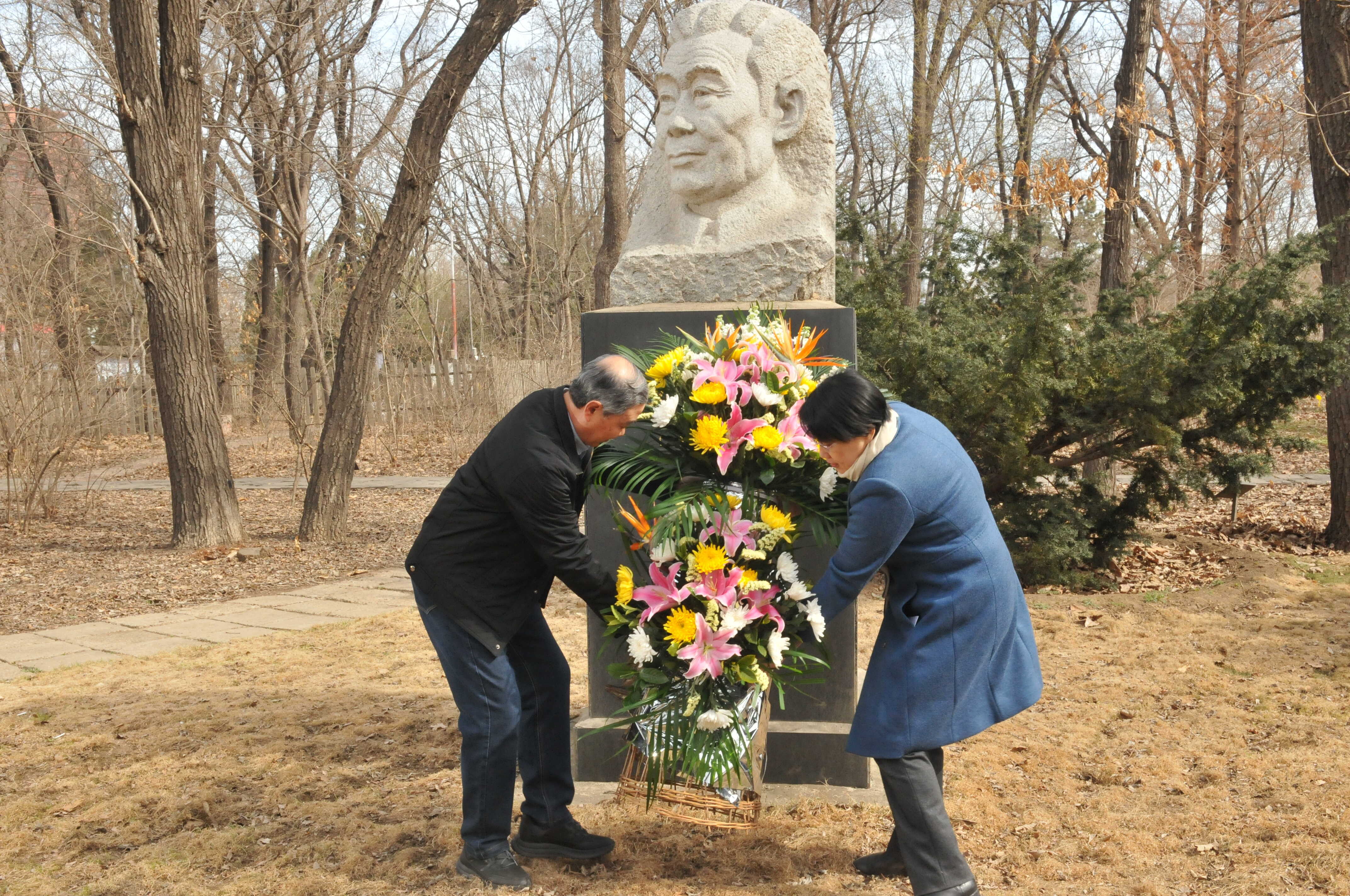 党委副书记、纪委书记郝欣和树木园主任何兴元研究员向刘慎谔先生雕像敬献花篮