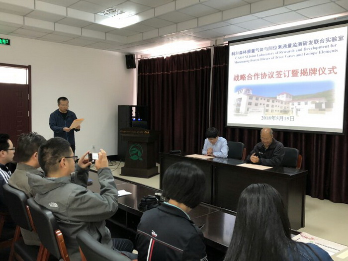 清原站副站长于立忠正高工主持了揭牌仪式,他表示“科尔联合实验室”的成立是清原站的重要里程碑,标志着清原站森林痕量气体通量研究进入新阶段,希望合作双方团结协作,充分发挥各自优势,推进监测方法技术与应用研究的深度融合,同时欢迎各位科学家到清原站参与科研工作,有更多的文章成果标注“科尔联合实验室”。最后,于立忠表达了对“科尔联合实验室”的美好祝愿,希望实验室成为清原站科研航母重要力量,在研究浪潮中披荆斩浪,让今天的“科尔”成为明天的“贝尔”(贝尔实验室)。于立忠当场宣读了“科尔森林痕量气体与同位素通量监测研发联合实验室”战略合作意向书,朱教君、周新华代表双方合作单位在协议书上签字,并举行了揭牌仪式。