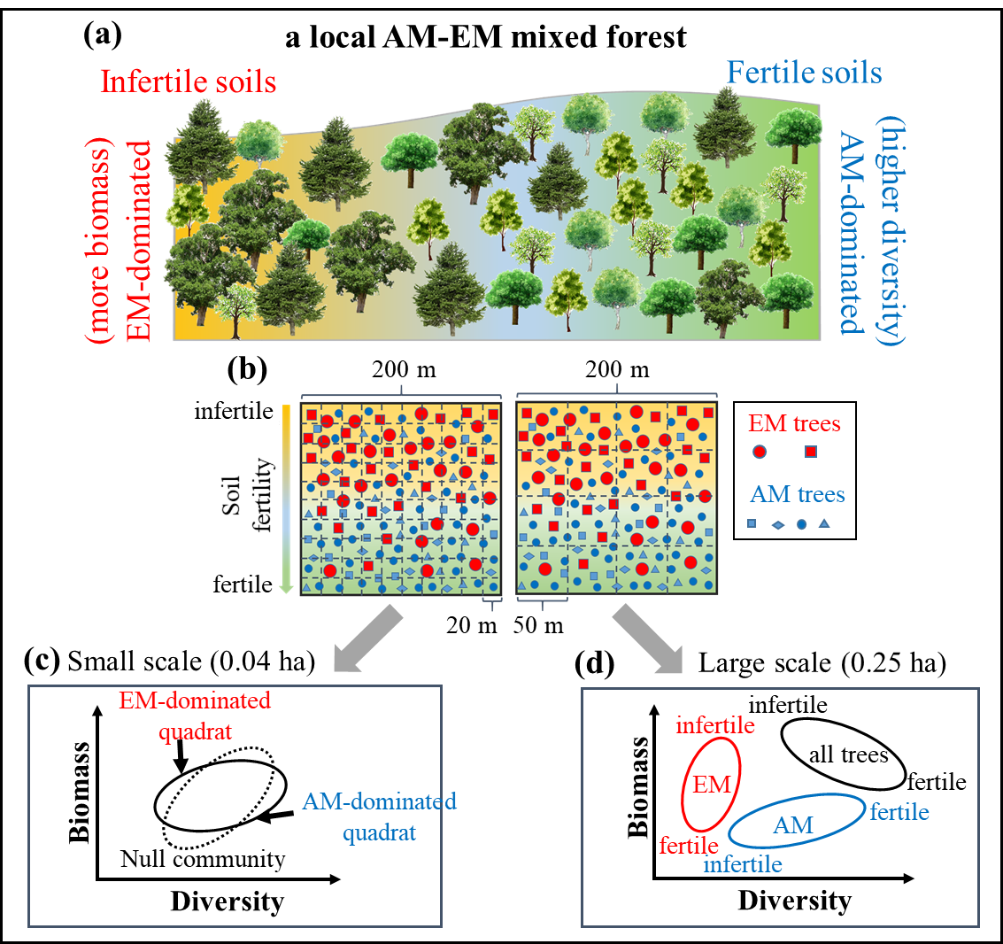 Mao et al., 2023. Scale-dependent diversity–biomass relationships can be driven by tree mycorrhizal association and soil fertility. Ecological Monographs, e1568. https://doi.org/10.1002/ecm.1568.