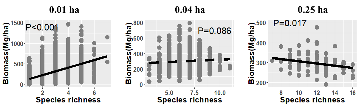图2. 森林群落多样性与生物量的尺度依赖关系(以长白山样地为例)