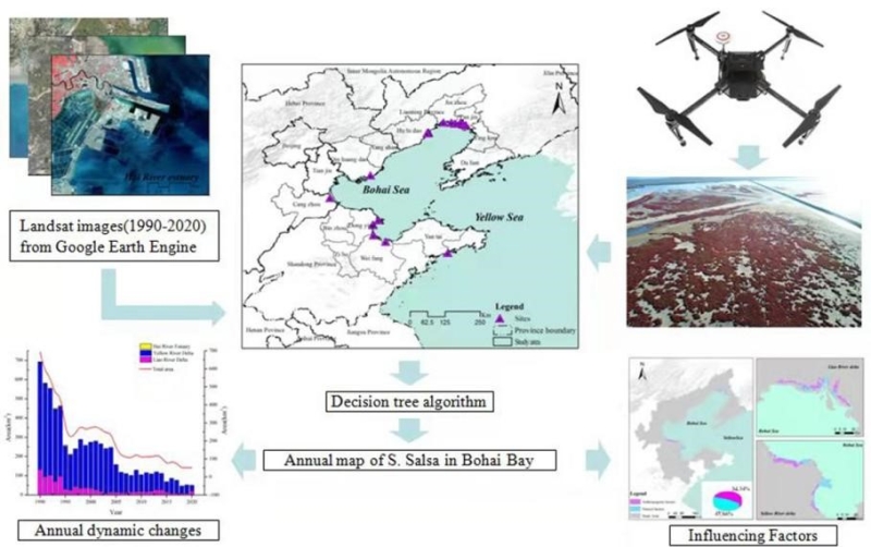 上述成果以“Evolutions of 30-Year Spatio-Temporal Distribution and Influencing Factors of Suaeda salsa in Bohai Bay, China”和“Ecological and Environmental Effects of Estuarine Wetland Loss Using Keyhole and Landsat Data in Liao River Delta, China”为题发表在Remote Sensing 14(1), 2022和13(2), 2021上。我室博士研究生尹红岩为第一作者,我室刘淼研究员和李春林副研究员为共同通讯作者。该研究得到了国家自然科学基金委重点项目、面上项目和重点研发等项目的支持。