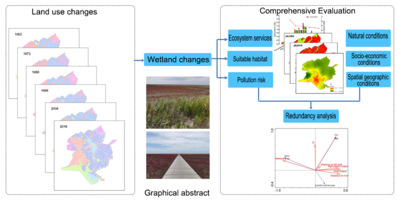 我室以典型北方滨海湿地—环渤海区域为例,利用Landsat数据,首先利用谷歌地球引擎(GEE)解译得到1990-2020年连续30年典型滨海植被—盐地碱蓬空间分布结果。从人为因素和自然因素两个方面,利用主成分分析(PCA)和二元逻辑斯蒂回归模型(Binary logistic regression),对盐地碱蓬变化影响因素进行分析。并以典型滨海河口湿地—辽河三角洲为例,利用锁眼(Keyhole)和 Landsat数据,获得1962-2016年共6期辽河三角洲的土地利用数据,生态环境影响包括生态服务价值、鸟类生境适宜性、重金属的潜在生态风险三个方面。最后通过冗余分析对土地用利用变化、湿地流失及生态环境影响驱动力进行分析。