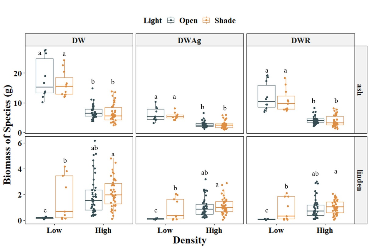 图1:光环境和同种密度对水曲柳和紫椴幼苗生长的影响