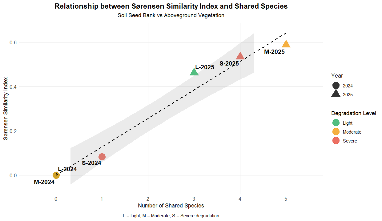 图2 2024—2025 年轻度、中度、重度沙化草地土壤种子库与地上植被的 Sørensen 相似性指数及共有物种数之间的关系