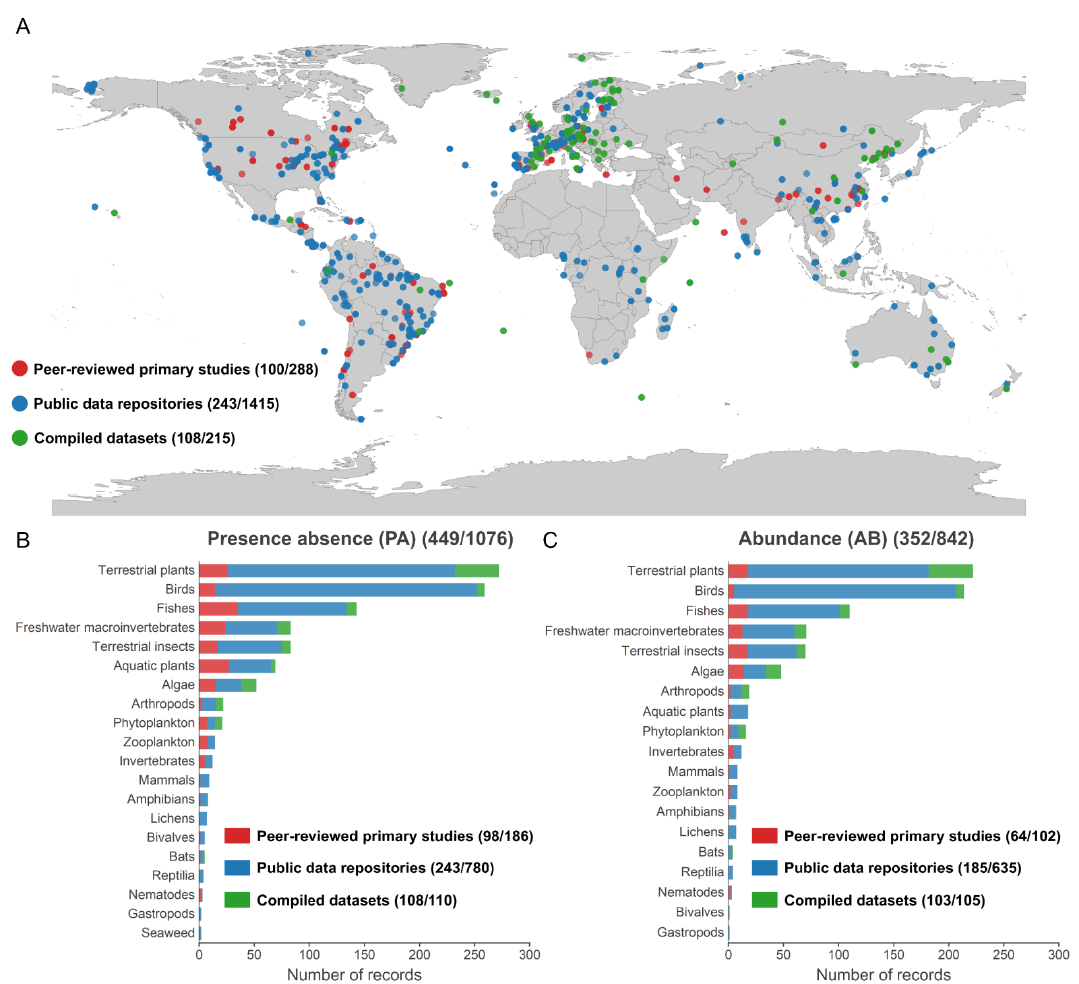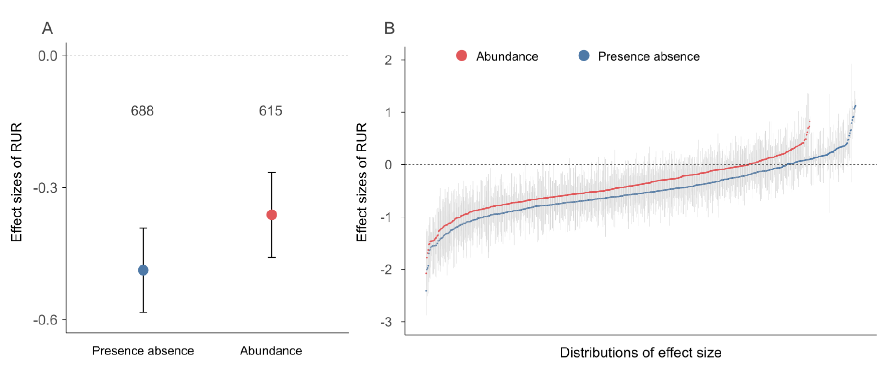 为此,中国科学院沈阳应用生态研究所森林生物多样性与生态系统功能团队整合多源数据(文献研究、公开数据库与数据集汇编),在全球尺度开展整合分析,系统探讨了不同生物类群中(如陆生植物、鱼类和鸟类等)二者关系的分布格局及其驱动机制。结果发现:无论基于何种数据类型(即0-1与多度数据),不同生物类群中二者关系均普遍表现为显著负相关,即物种丰富度更低的群落或地点往往呈现更高的生态独特性。此外,上述四类因素共同影响了二者关系,但其相对重要性在不同数据类型之间存在差异。总体上,物种库(例如稀有物种占比和总物种数)对基于0-1数据的二者关系具有主导影响,而扩散限制则主要影响基于多度的二者关系。上述结果表明,生物多样性保护策略应优先统筹兼顾物种丰富度与生态独特性,在空间上整合高丰富度与高独特性群落,从而实现保护效益的最大化。