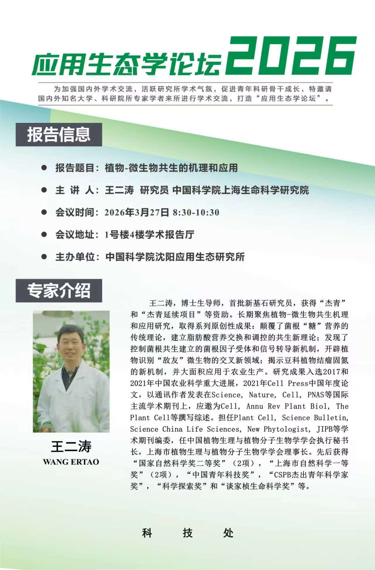 为进一步加强国内外学术交流,扩展科研人员知识面,促进青年科研骨干成长,提高研究所人员整体科学研究水平,2026年 “应用生态学论坛”系列活动全新升级。欢迎广大科研工作人员及研究生积极参与!