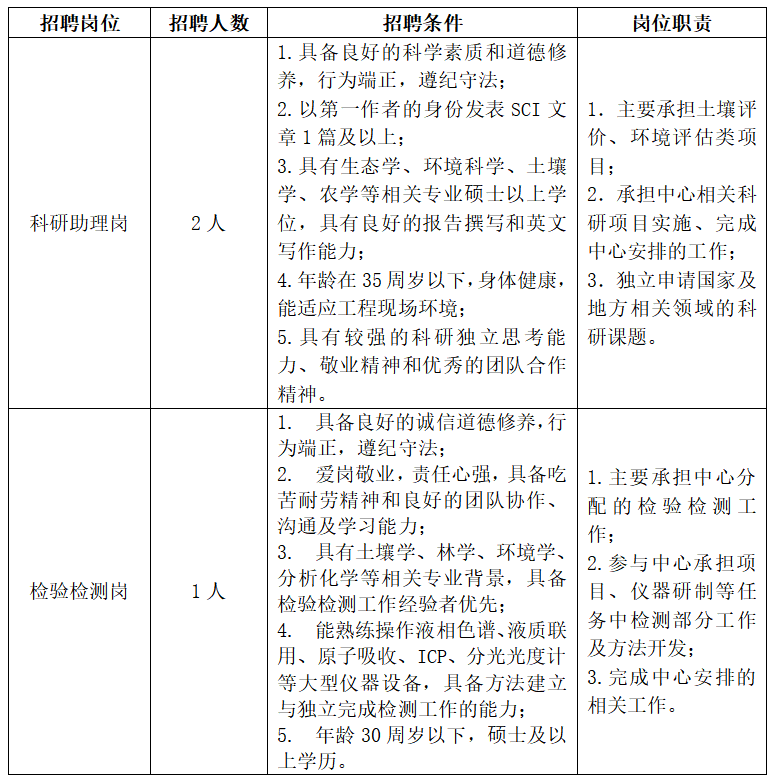 中国科学院沈阳应用生态研究所分析测试中心(农产品安全与环境质量检测中心)现因工作需要,面向社会公开招聘工作人员3名。具体要求如下: